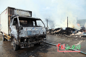 事發現場位于月湖區四青辦事處老206國道旁的佰藝日盛家具木業院內。一工人解釋說,損失主要是大量剛剛做好還沒賣掉的木門,還有1輛小貨車。