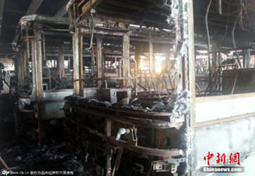 起火原因是停在新大橋下的一輛公交車儀表處突然竄出火苗,幾分鐘后,蔓延的大火迅速吞沒(méi)了相鄰的9輛公交車、1輛私家車和1輛房屋專業(yè)補(bǔ)漏車,油箱、輪胎相繼爆炸,現(xiàn)場(chǎng)一片汪洋。