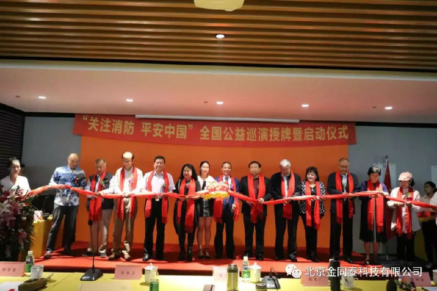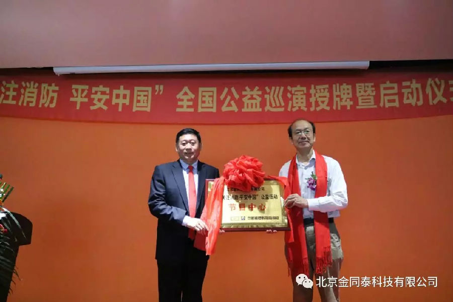 授牌儀式前,國家一級演員、“關注消防 平安中國”節目中心藝術總監藍劍老師,北京金同泰科技有限公司董事長郭文麒先生,中國慈善總會大眾慈善促進委員會執行會長張倩玉女士,中國國際教育電視臺副臺長陳聯勝先生等領導分別致辭,表達了對“關注消防 平安中國”公益活動的良好祝愿。隨后進行了三方備忘錄簽約儀式。 張倩玉、 陳聯勝分別將“關注消防 平安中國”公益活動“支持單位”的牌匾和“關注消防 平安中國”公益活動“節目中心”的牌匾分別授予北京金同泰科技有限公司。金同泰公司郭董事長和常務副總經理張勇分別代表金同泰公司從領導手中接過兩塊牌匾。隨后領導和嘉賓共同為“關注消防 平安中國”公益活動授牌暨全國消防主題公益巡演活動啟動進行剪彩。標志著“關注消防 平安中國”全國消防主題公益巡演活動正式啟動。