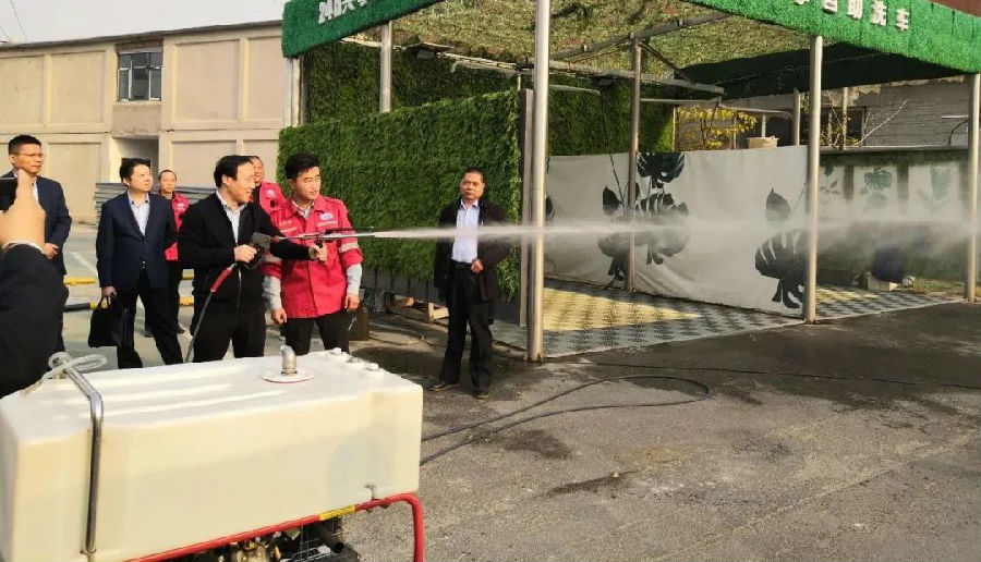 金同泰技術人員為諸位領導介紹了移動式高壓細水霧滅火裝置的操作規程,并做了滅電火和滅燃氣火的演示。與會領導親自體驗了“天下第一槍”的滅火威力。