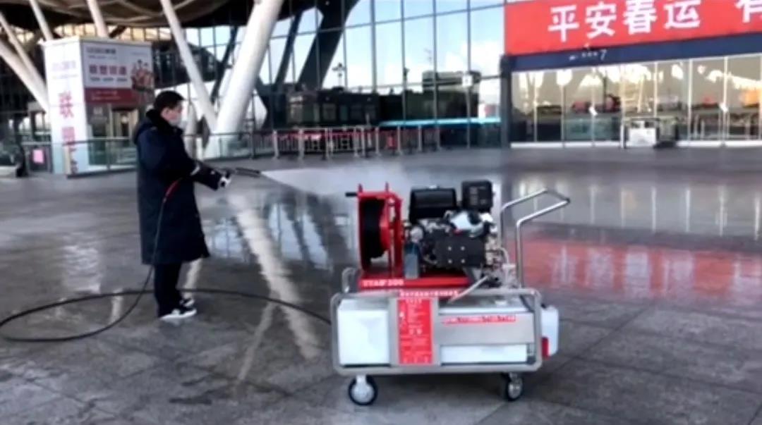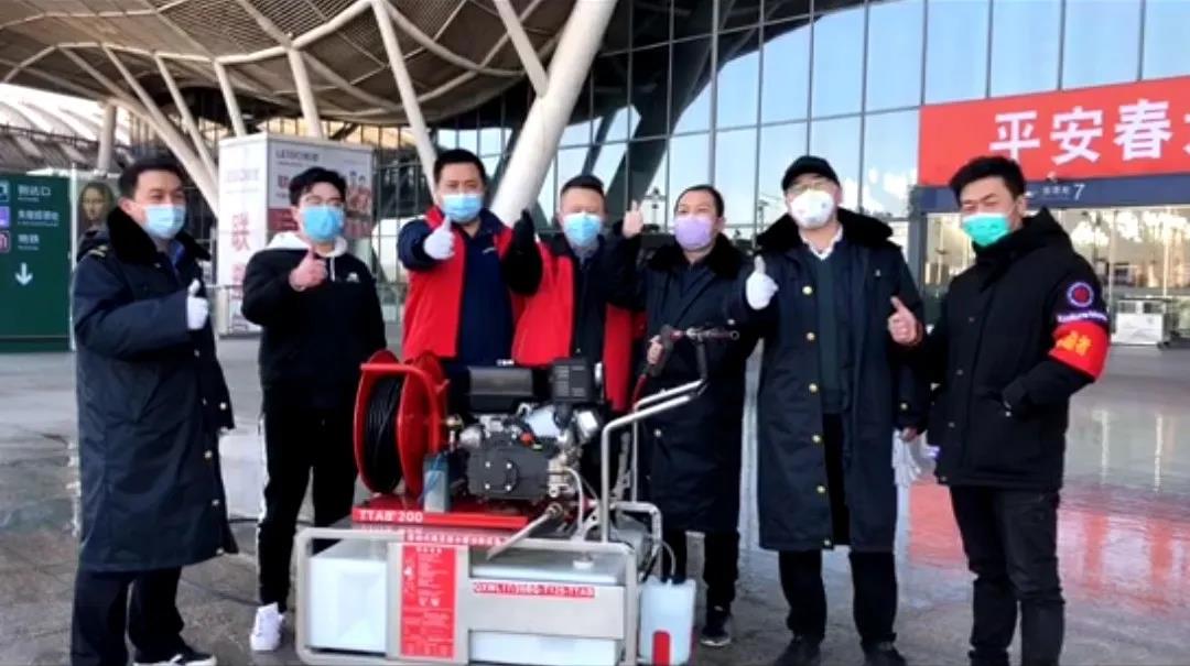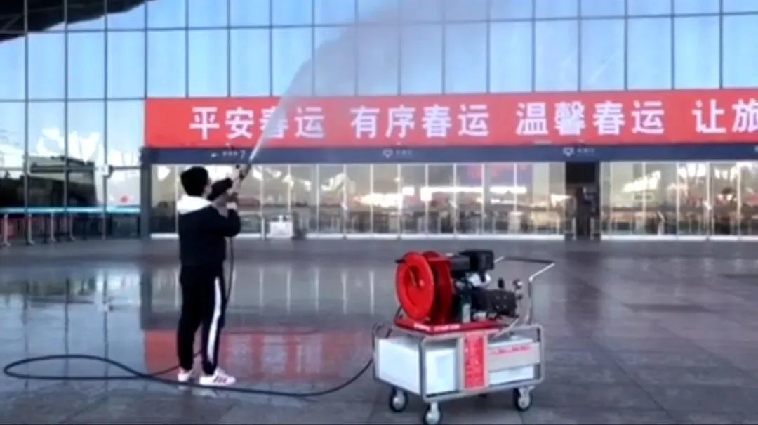 北京金同泰科技有限公司捐贈的黑科技——移動式高壓細水霧消毒滅火設備已在武漢高鐵站、安全生產指揮中心、候車室、行車室等重點場所消毒工作中發揮積極作用,為武漢高鐵站做好新型冠狀病毒感染肺炎防控工作提供了有力保障!